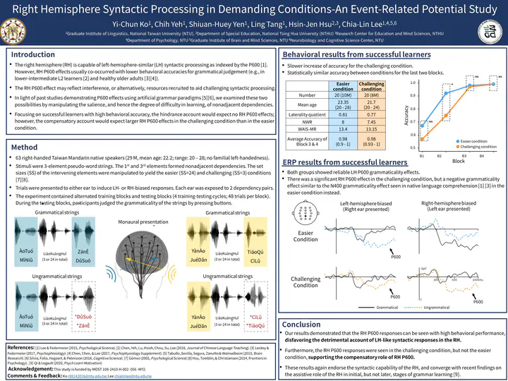 The right hemisphere (RH) has been found to possess left hemisphere (LH) equivalent syntactic processing ability as indexed by the P600s to some grammatical errors. RH P600s, however, are sometimes associated with lower behavioral accuracy for grammaticality judgment (e.g., in moderate L2 learners or healthy older adults), and such association could reflect a detrimental effect for syntactic processing (due to potentially conflicting outputs across hemispheres) or compensatory attempts from the RH under more challenging processing conditions. To clarify, we recorded Event-Related Potentials (ERPs) from 67 young right-handers while they monaurally learned and judged the grammaticality of 3-element strings generated based on predetermined artificial grammar rules- non-adjacent dependencies between the 1st and last elements. We additionally manipulated the difficulty level of learning these dependencies by varying the size of the set from which the intervening 2nd elements were drawn, creating salient (i.e., easier to learn) and less salient (more difficult to learn) dependencies. To adjudicate between the two possible accounts for the RH P600, we focused on successful learners only and contrasted ERPs over the last 2 blocks to include data only after high proficiency was attained. Despite comparably high behavioral performance, we found a LH-only P600 effect in the easier condition (accuracy=0.98%, N=20), but bilateral P600 effects in the more challenging condition (accuracy=0.98%, N=20). These results thus disfavor the hindrance account of the RH P600 responses, and instead support the compensatory role of the RH P600 in challenging syntactic processing/learning tasks.